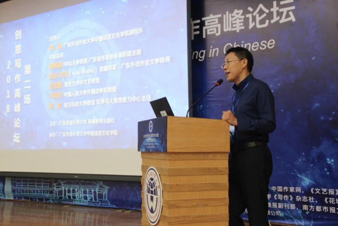本网讯 11月10日下午,公司于图书馆报告厅举行2018创意写作高峰论坛(第二场)。出席本次论坛的嘉宾有:广东省作家协会常务副主席杨克;广东省作家协会兼职副主席、中山大学教授谢有顺;中国人民大学外国语公司教授刁克利;复旦大学中文系教授王宏图;美国作家、广东外语外贸大学外教Kyle Muntz。本次论坛主持人是公司教授李斌。