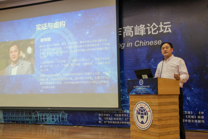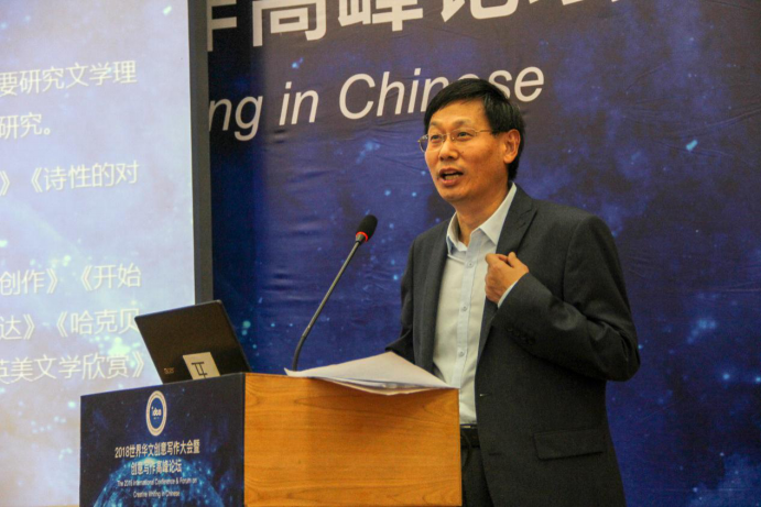 首先,谢有顺发表题为《实证与虚构》的演讲。他强调:“想象力是创意写作的核心,我们应该倡导对不确定知识的追求,以形成个体的审美能力”。他还说道:物化的、确定的知识正阻碍着这种能力形成,如今人们探索太空的愿望在减弱,想象力在衰微,便是最好的例证。”他结合实际提出观点:普罗大众不应该太过迷信科学,在人工智能迅速发展的今天,仍然需要保持想象力。同时他又以《<三体>中的物理学》一书为例证,说明想象力虽可天马行空,但仍要对其保持警觉,要讲究实证,立足于实践,要“受现实的启发与限制”,不能过分虚无。