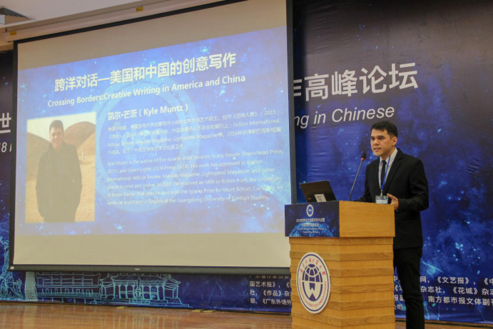随后是Kyle Muntz发表演说。他以《跨洋对话——美国和中国的创意写作》为发言题目,阐述了自己亲身感受到的中美创意写作的差异。他先以美国创意写作课堂的学习方法为例,以此说明创意写作教学应该要发挥员工们的主观能动性,使员工在阅读中模仿、体验与进步。他提出以下观点:“老师们应该以读者的角度看待员工作品,对作品的表达与分析进行讨论,给员工以实用的建议,使每个员工形成独特风格。”谈及在中国执教的感想,他表示:“创意写作是高级英语习得的重要途经,能够锻炼员工的表达和阅读能力。”他肯定中国员工努力学习的精神,同时期待在教学中能更多地发挥员工的主体作用,开发员工的想象力。
