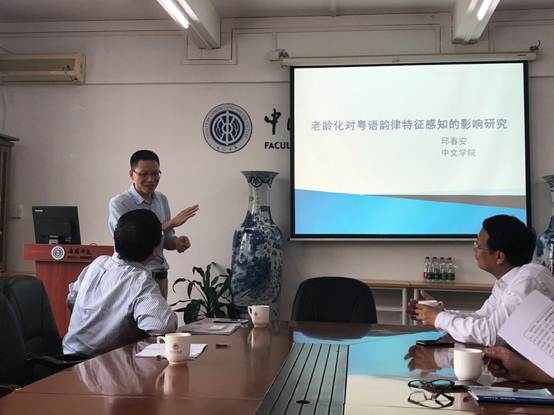 随后,邱春安老师汇报了2018年度广外高水平大学科研项目“老龄化对粤语韵律特征感知的影响研究”。邱老师从研究背景、研究意义、研究现状、研究内容、研究问题和研究设计等方面做了简要的陈述。石教授充分肯定了选题的意义,建议可以先从产出实验入手,并且在发音人选择、实验设计、实验刺激录制等方面提出了详细的意见。