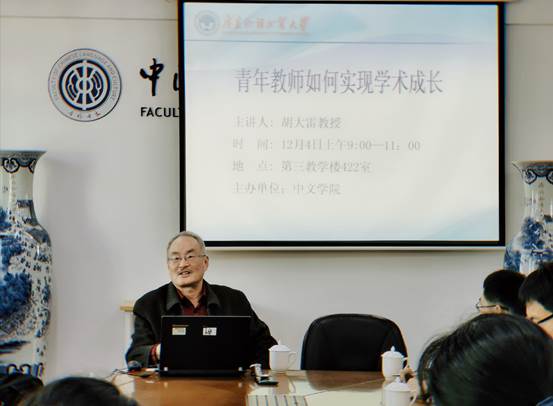 讲座正式开始之前,陈恩维教授对胡大雷教授做了简单的介绍,并表示热烈的欢迎。胡教授的讲座内容主要分为三个部分:一、胡教授首先鼓励青年教师在自己的专业领域里要有当专家的积极想法,并以自己亲身经历劝告青年教师脚踏实地专心钻研学术道路,不贪名誉,不畏坐学术的“冷板凳”。二、胡教授建议青年教师要有清晰的学术规划。他形象地将科研工作比喻成一颗大树,并将科研成果比喻为挂在树上的果实。胡教授还拓展阐释了集中和分散的关系,建议教师们在打好专业基础后及时转换方向,为今后开拓自己更广阔的路作准备。三、胡教授告诫青年教师们要自觉养成良好的工作习惯。胡教授以自己面对工作台便立刻就能够投入工作的个人经验做示范,提醒大家要养成良好习惯必先考虑方法。另外,胡教授还谈及,对主观化特征较明显的中文学科来说,当下的青年教师应钻研怎样将科研做得具体化、客观化,并建议文学应当和文献学、历史、时政结合在一起,产生具有创新性的科研成果。