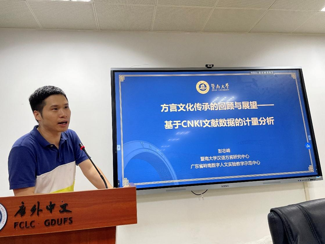 本网讯 2023年4月14日19:00-21:30,省级研究基地广东省岭南数字人文实验教学示范中心副主任,暨南大学汉语方言研究中心研究成员彭志峰老师,在广东外语外贸大学第七教学楼407会议室开展“方言文化数字化的技术实现与论文写作”讲座。BEATS严修鸿主持讲座,魏慧斌、邱春安、贝先明、杨慧君、丁沾沾等教师及BEATS的学术型及专业硕士研究生聆听了本次讲座。