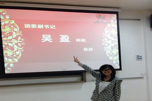 吴盈在大二时“空降”成为公司秘书部部长,大三通过全院公开竞选担任公司团委副书记。谈到屡次“空降”团学的经历,她表示,工作与自己的性格相符是作出这种选择的重要因素。为了尽快适应和熟悉新的工作,她一边向前辈取经,一边寻找与干事相处的最好方式,努力做到“带活一个部门”。也缘于这种责任感,她三次参与三下乡的支教活动,其中两年担任服务队队长,第三年带领心有黎溪服务队勇夺广东省重点团队称号。对于每一个暑假都下乡,吴盈称“一方面是要尽力回馈社会,另一方面是喜欢和一整个团队向同一个目标奋斗”。
