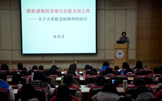 魏朝勇表示,虽然《安提戈涅》创作的时间先于《俄狄浦斯王》,但从剧情上来看,《安提戈涅》可以视为《俄狄浦斯王》的续集,说的就是俄狄浦斯的女儿安提戈涅的悲剧。魏朝勇开玩笑道:“安提戈涅是女汉子的先驱。” 安提戈涅不顾国王禁令,勇敢站出来埋葬了自己的哥哥,因此获罪致死。魏朝勇认为,该悲剧所反映的矛盾冲突是安提戈涅与克瑞翁谁是谁非的问题,也就是人律和神律之间的冲突,这也是造成悲剧的根源。魏朝勇指出,她之所以勇敢站出来安葬自己的哥哥,是出于一种友爱的心,出于一种对亲人的义务,这只是她个人的行为,严格来说,她并不是古希腊神话中传统意义上的英雄式人物。“从主人公形象的变化,我们可以看到这样一个转变:神化了的英雄——理想化的形象——现实中的人。作者正是朝着现实人物的方向一步步走近,体现出神的形象逐步淡化,人的地位逐步升上来。”