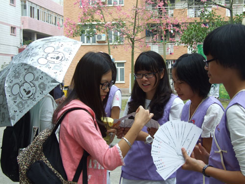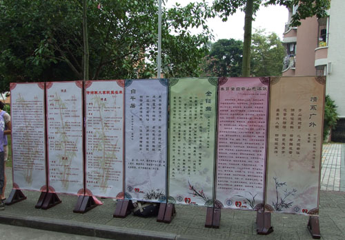 本网讯 2012年10月24、25日中午及下午,在云山学12栋前进行了校园古典诗词赋创作大赛的优秀作品展示活动。不同于往届通过晚会来展示优秀作品的方式,本次诗词赋大赛选择将一等奖作品印在屏风上进行校道展示,同时将它们制作成精美的书签,让对诗词赋感兴趣的同学可以挑选自己喜欢的作品书签留作纪念。据了解,在所有派送的书签中,最受欢迎的是印有本届诗词赋创作大赛冠军获得者、来自BEATS文管092班的吴晓丹同学所作的《金镂曲》的绿色书签。而其中的一句“醉看谁主九州权斗”,恰好也生动表现了此次大赛优秀作品的丰富之状。