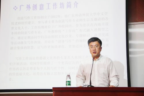 在活动的最后一个环节,刘海玲老师从北京大学今年的研究生方向设创意写作专业谈起,谈到广外的创意写作已经成功开展多次作家讲座。诺贝尔奖得主法国作家勒·克莱齐奥,中国著名作家毕飞宇,加拿大华裔作家薛忆沩和省内外多名知名作家陆续被公司和工作坊聘请为专业导师。她感谢同学们参与创意写作专业的建设和发展,表达了对同学们的希望,也提出了专业学习的相关要求。一要“静读书,深思考”,要不为外界干扰,用自己独特视角去观察世界,要形成自己对世界的看法。二要“定计划,远目标”,要定好长期读书写作计划,目标长远,不局限与校门,视野要开阔。三要“比毅力,爱写作”,要热爱自己的专业,持之以恒的投入文字的创作中,不能半途而废。并详细说明了创意写作专业员工在校期间应该完成的写作任务。