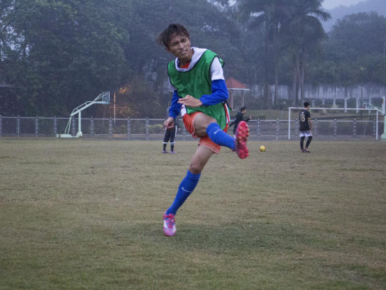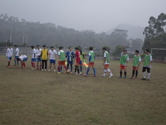 本网讯 12月3日下午五点十五分,中文对英文的足球联赛在财院操场举行。当日比赛的天气状况并不理想,较低的气温以及潮湿的场地给运动员们带来了不少困难,但运动员们对球赛的坚持战胜了恶劣天气的阻碍。做好热身运动以后,运动员准备就绪,正式上场。