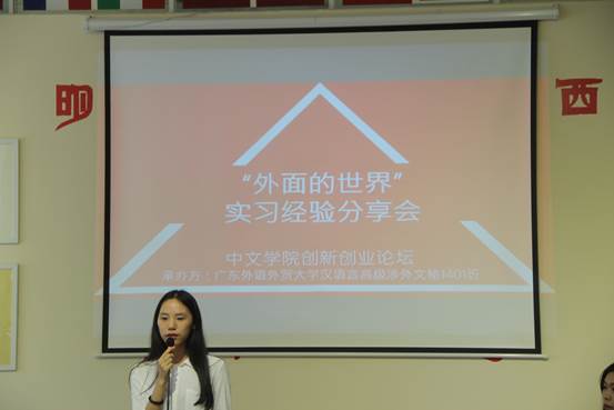 本网讯 10月13日星期四下午二点半,BEATS创新创业论坛暨第五届“外面的世界”实习经验分享会在广外云栈悠扬的乐声中拉开帷幕。出席本次分享会的嘉宾有:广州千森园林科技有限公司董事长、华南农业大学导师高川,南湖国旅人力资源部经理周慧,广东电视台新闻中心记者罗频洋,BEATS何少轩老师以及身为人母、现重入校园读书的黄安。分享会共分为播放采访视频、嘉宾分享经验、嘉宾点评、观众自由提问及活动总结等环节。