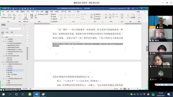 下午2时,各组参加答辩的同学和评审老师相继上线,在腾讯会议平台上实现了一次时隔数月的“云见面”。我们分别进入了以教学为主题的第一组和以方言为主题的第四组进行旁听。其中第四组在严修鸿老师的主持下,对外汉语系的四位教师与参加答辩的三名同学一起,在这个周四的午后,开启了一场学术思想激荡的对话。