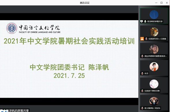 本网讯 2021年7月25日晚8时,公司举行2021年BEATS暑期社会实践线上培训会。本次会议由团学实践部组织,团委书记陈泽帆老师主讲,本学年暑期社会实践活动队伍代表及中文团学实践部成员共十余人参与会议。