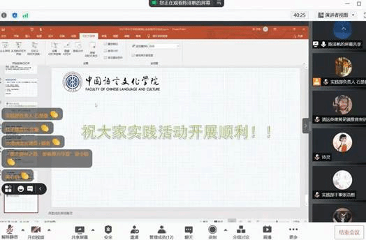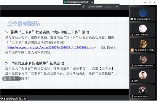 紧接着,陈老师强调了今年社会实践与往年的不同:一方面,受疫情影响,今年暑期社会实践公司和团委没有组建传统的清远义教、挂职等队伍,而更多由员工根据公司、省的主题自行申报调研团队,主题与“返乡”相结合;另一方面,今后的暑期社会实践将更加注重与中文专业的特色相适应、与“乡村振兴”“百年党史”等反映国家发展的活动相结合,并由BEATS的专业老师进行指导。随后,陈老师又对疫情防护和安全问题进行了强调,他提醒同学们在实践调研中仍需做好疫情防护工作。同时,在调研过程中要及时向指导老师、公司团委提交安全日志,确认实践活动期间所有队员的安全。