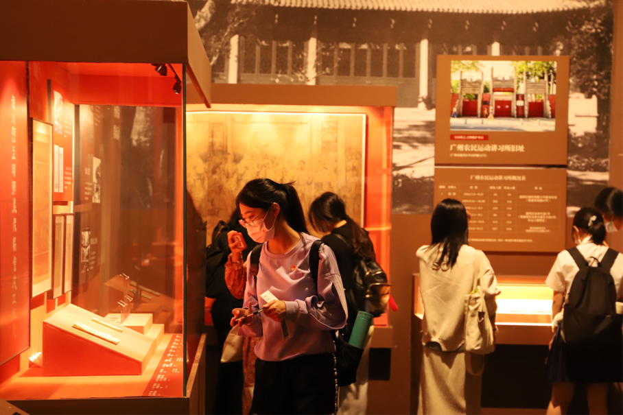 随后,全体老师、同学有序地进入省博参观百年党史纪念展。循着迂回的路径前行,一件件带着历史厚重的展品,一段段满载光荣与热血的文字,将中国共产党百年以来在南粤大地的奋斗路,生动地展现在大家眼前。