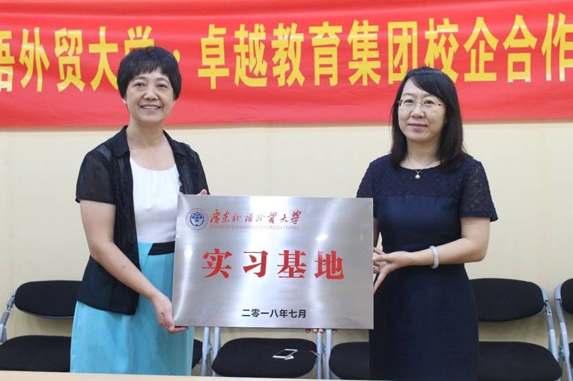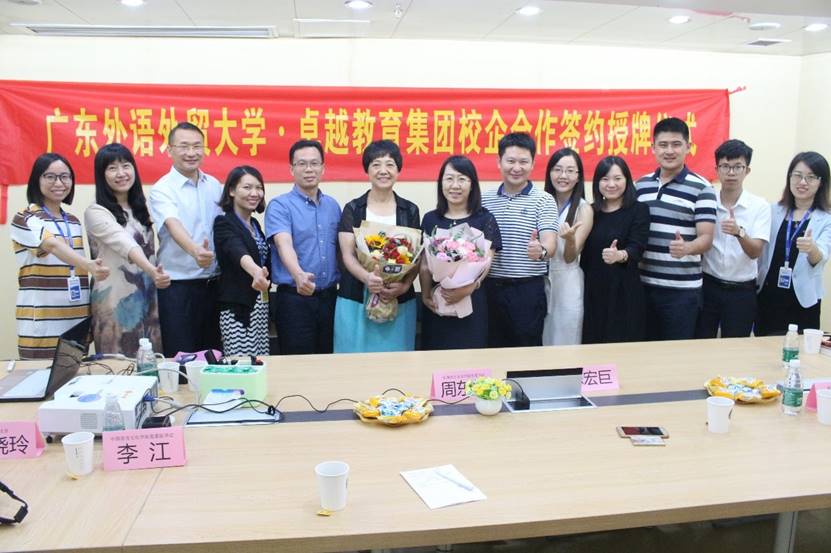 本网讯 7月26日下午,广东外语外贸大学同卓越教育集团在集团总部签订校企合作协议,广东外语外贸大学中国语言文化公司党委书记周东兰,教务处副处长袁琦,就业指导中心副主任肖锋、BEATS党委副书记李江、办公室主任巫晓玲、团委书记杨韬、辅导员陈泽帆同卓越教育集团英才事业部总监陈宏巨、人力发展部经理徐蔚、人力发展部HRBP徐越、集团总部人力发展中心经理邓笑梅、傅邵萍、人力资源主任陈素慧参加了此次签约授牌仪式。