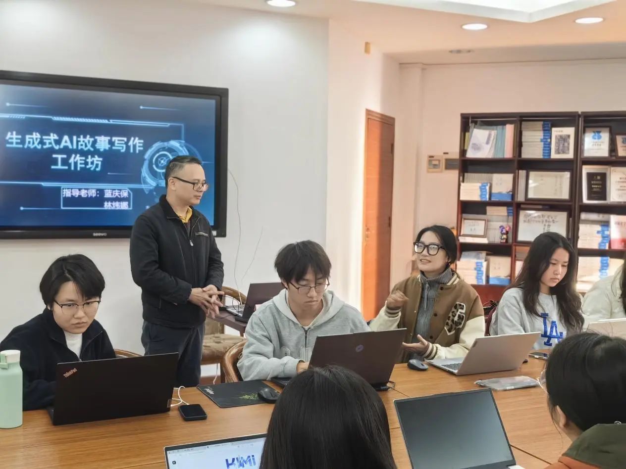 2025年1月7日上午,由澳门科技大学博士研究生、东莞开放大学蓝庆保老师和广外林炜娜老师主讲的生成式AI故事写作工作坊在广东外语外贸大学白云山校区七教412教室举行。本次写作工作坊不仅介绍了AI写作的基本操作和技巧、探究了AI与人类写作创意的融合途径,也以师生互动的工作坊形式为怀揣故事创作梦想的15名同学打开了一扇通往全新写作世界的大门。