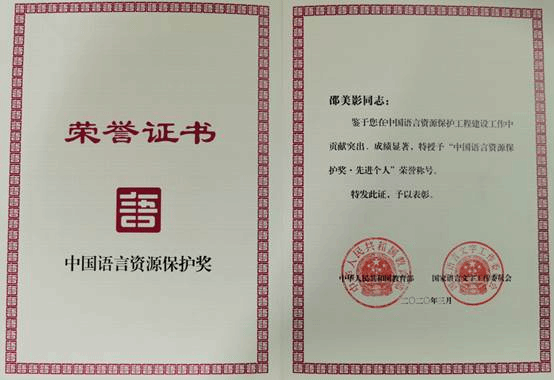 2016级邵美影获教育部“中国语言资源保护奖”先进个人