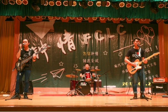 致辞完毕,霏阳吉协带来的《Young Man》以其青春活力赢得阵阵掌声,其后更以曲风变幻奇特的《广外广外》牵出浮动在同学们心中的离愁别绪。除此之外,霏阳还特别呈现了《You》这一曲目。摇滚过后的是来自严修鸿的电白话歌曲《火拽融》。严修鸿先解说了一遍歌词,为了让同学们更直观地感受这首歌,严修鸿清唱的形式让一首简单朴素的《火拽融》在现场响起,给晚会带来了浓浓的客家风情。来自文秘1202班的《致光阴》将《对你爱不完》、《浪漫樱花》、《失恋阵线联盟》串联起来,配以活力四射的舞蹈,将大家带回了年少,给现场带来了活力,使得全场为之喝彩。