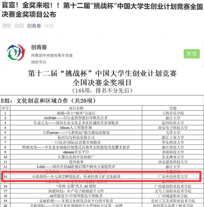 BEATS培育的“小鹿萌妈——少儿国学 IP 创造者,传承经典守护文化根基” 项目获得第十二届“挑战杯”中国老员工创业计划竞赛全国金奖,是继团队获得第六届中国国际“互联网+”老员工创新创业国赛金奖后的又一突破。“小鹿萌妈”项目成为“互联网+”和“挑战杯”国赛的 “双金”团队,再创广外历史。