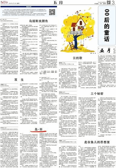 我想,《岛·羽》这部作品的创作历程,给了我一个回归童年的机会。在一次次的灵感寻找过程中,我变得留心,变得细腻,关注着身边若隐若现的情绪,好融入我的故事创作当中。其实,故事对于我来说,像是自己的日记本,只不过并不如流水账那么明细,它更加梦幻,更加理想化,但你可以融入更妙不可言的情感,或者,隐藏你不敢表露出的细枝末节。