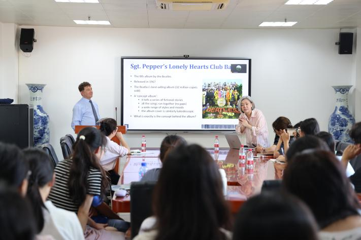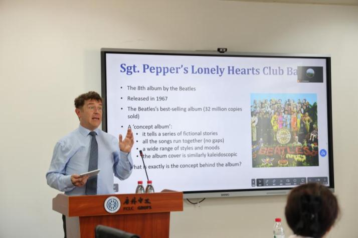 讲座分为两个部分,第一部分Collins教授分析了披头士乐队最著名的一张专辑《佩珀军士的孤独之心俱乐部乐队》,阐述创作者如何从20世纪英国马戏团传统中获得灵感。在历史背景分析与现场沉浸式感受的共同作用下,同学们更切身地了解到这种极具英式特色的音乐厅和杂耍剧场传统,让人们得以窥见1967年披头士乐队在构思和制作这张最具开创性专辑时的内心世界。