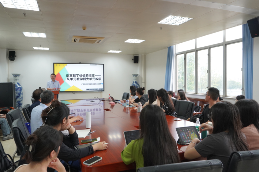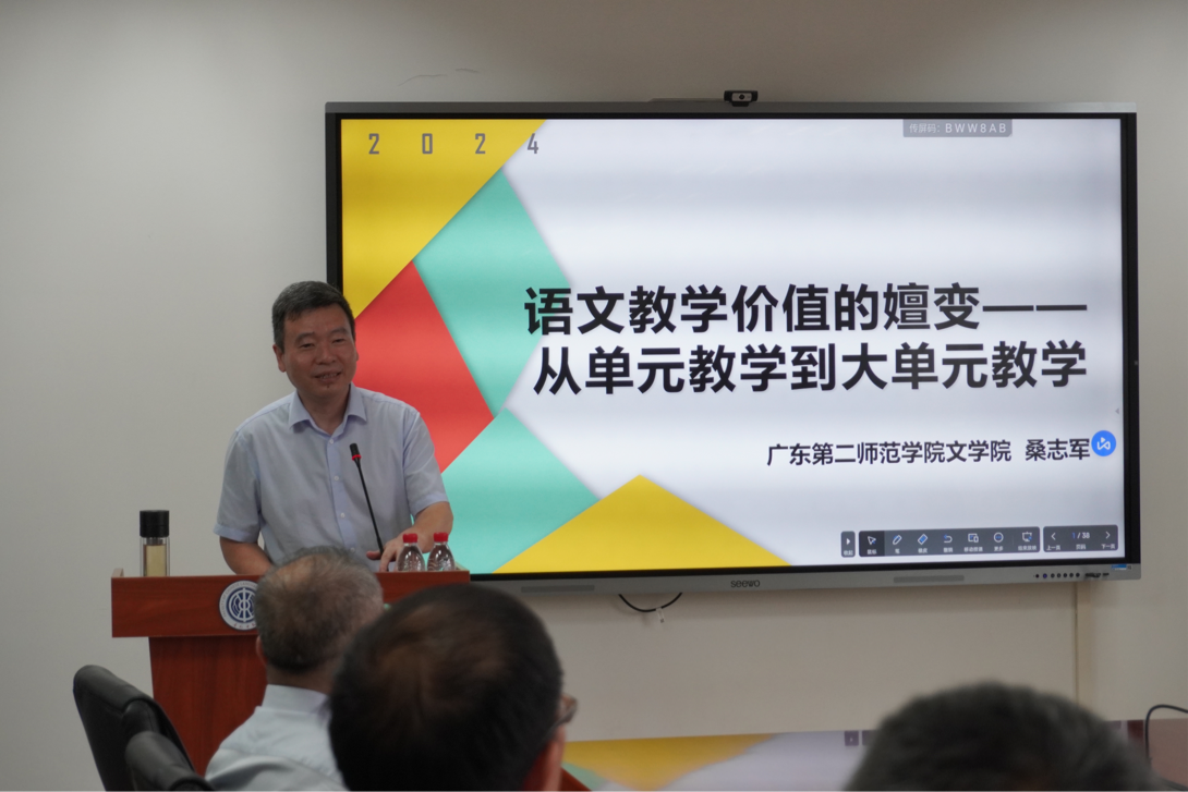 2024年6月6日下午,广东第二师范公司文公司经理、广东省高校教学名师桑志军教授应邀为公司师生带来了以“语文教学价值的嬗变—从单元教学到大单元教学”为题的精彩讲座。陈恩维经理、于屏方副经理、李斌教授以及BEATS部分员工参与了本次讲座,学科(语文)中心贝先明主任主持了本次讲座。