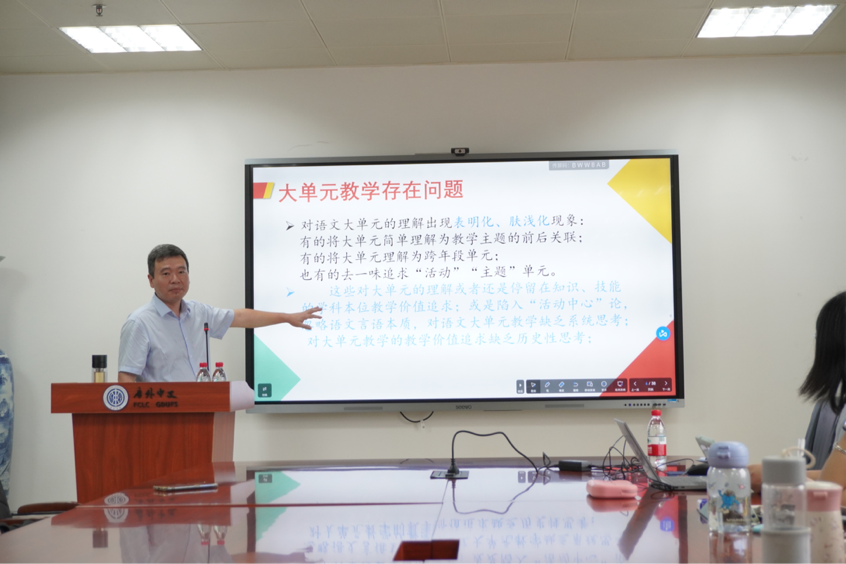 首先,桑教授梳理了语文单元教材的编写脉络,引导大家从语文教学价值追求视角探讨单元教学的意义。随后,桑教授向在场师生介绍了语文单元教学法的兴起背景及深入发展情况。桑教授认为在发展初期的单元教学法仍停留在范文教学模式。进入新世纪后,出现了单元教学变式,包括单元整体教学、语文主题教学、语文群文阅读教学,这些变式使得语文学习的外延得到充分的发展。最后,随着语文教育进入核心素养时期,语文单元教学也发展到了新阶段,即大单元教学时期。桑教授通过区别知识单元和学习单元,进而得出大单元是按学习逻辑展开的学习单位的结论,并提出大单元教学具有以下特点:以语文核心素养为大单元教学目标、以学习任务群为大单元教学的课程结构、以大概念统摄大单元教学的知识内容结构。